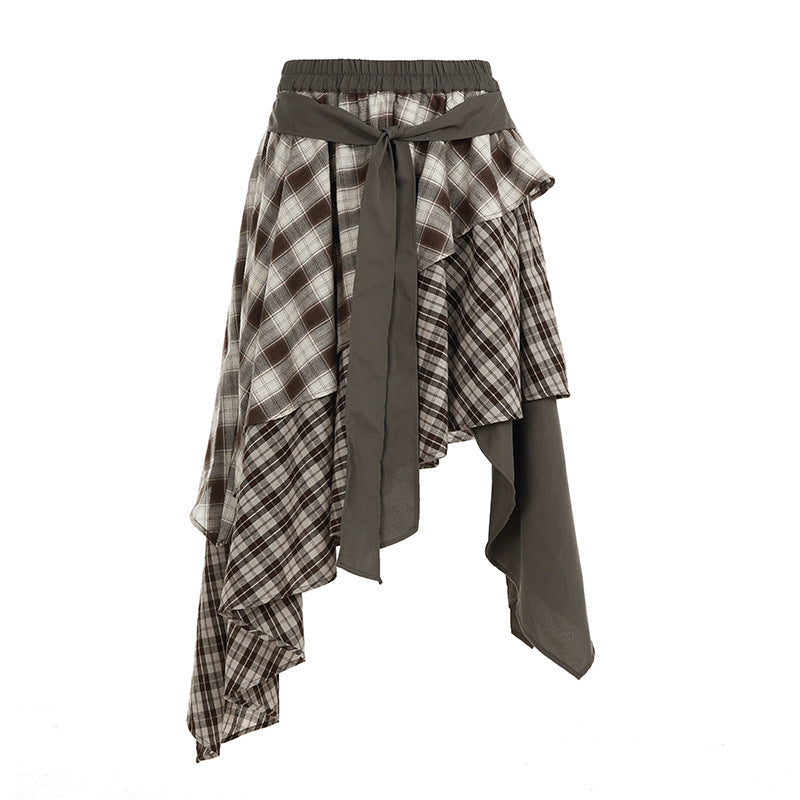 Color Block Plaid Irregular Hem Skirt High Street Spicy Layered Elastic Waist Loose A-Line Casual Long Skirt